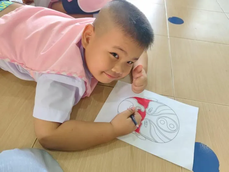 面对稚气未脱的一至三年级和幼儿园小朋友,我则分发空白脸谱,让他们照着PPT上的经典形象涂色。小手握着彩笔,一笔一画间,体现京剧脸谱色彩的魅力,通过颜色初识京剧角色。孩子们在涂鸦中感知中国戏曲的韵味,也在色彩中触摸文化的温度。