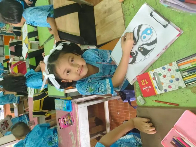 当教学遇上游戏,知识便如春风化雨,悄悄浸润孩子的世界。在面向泰国低年级小学生的汉语课中,我秉持着“寓教于乐”的理念,开展游戏教学法,将语言学习与互动游戏巧妙融合,让课堂成为一片洋溢欢笑与探索的乐园。在“运动”主题中,我们以“你来比划我来猜”为媒,将生词学习化为一场生动的肢体互动。孩子们用动作奔跑,跳跃,投掷,在欢笑中记住每一个词汇。身体成为语言的信使,动作化作记忆的锚点,词语不再孤立,而是与动态的画面紧密相连。当课堂进入五官主题,蒙上孩子们的双眼,听我的指令画出五官,一张张“怪脸”出现在眼前,让人忍俊不禁,也激起了学生的兴趣。在摸索与猜测之间,词语被赋予了温度。动物世界里,我们共玩“逛三园”——“动物园里有什么?”孩子们一个接一个喊出动物的名字,像打开一扇扇奇妙的认知之窗,重复与节奏巩固了记忆,使得词语识记生动而鲜活。而在数字的国度中,我们以“算式速达”游戏,将数字和汉语无缝连接,孩子们迅速读出算式,写出中文表达,数字成为节奏中的音符,思维竞技中的伙伴。