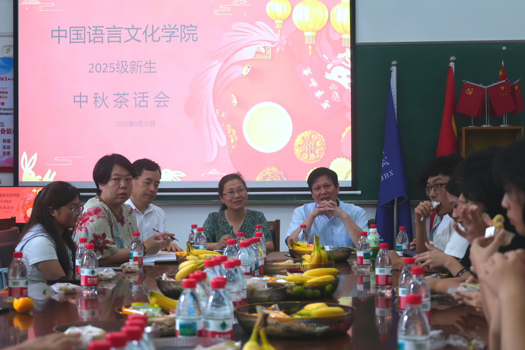 盈月揽芳华,美好共此时。值此中秋佳节来临之际,中国语言文化学院于9月30日下午在3-311举办2025级新生中秋茶话会。学院院长刘家思教授、党委书记王海红老师、副院长刘召明教授、党委副书记曹笑玮老师、学工办主任朱越男老师、辅导员钱欣怡老师,与来自全国多省市的假期留校新生欢聚一堂,共迎中秋,同叙情谊。
