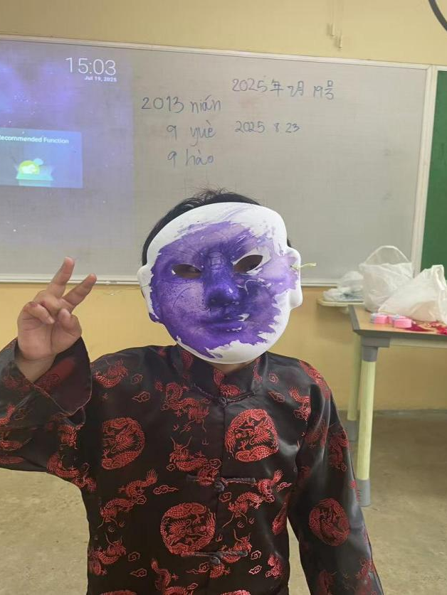 为进一步深化文化交流,除了常规课堂,实习团队还积极参与了春芭昙学校的周末中文兴趣班。这里不受年级限制,学生们自愿报名,课堂氛围更加自由,活动更富文化气息。在京剧文化体验活动中,以“讲解+实践”的形式让学生沉浸式感受传统艺术魅力。活动伊始,老师围绕京剧展开讲解:先介绍“生旦净丑”四大行当的角色特征,再重点解读脸谱色彩的象征意义,同时展示经典脸谱实物,结合简短京剧片段赏析,帮助学生直观理解京剧艺术的独特韵味。进入脸谱制作环节,学生们在老师指导下动笔创作:有的参照经典角色调色勾勒,力求还原传统纹样;有的发挥创意,在脸谱边缘添加祥云、花纹等元素。过程中,老师不时纠正线条走向、指导色彩搭配,孩子们专注投入,一张张鲜活的脸谱逐渐成型,满是对京剧艺术的喜爱。
