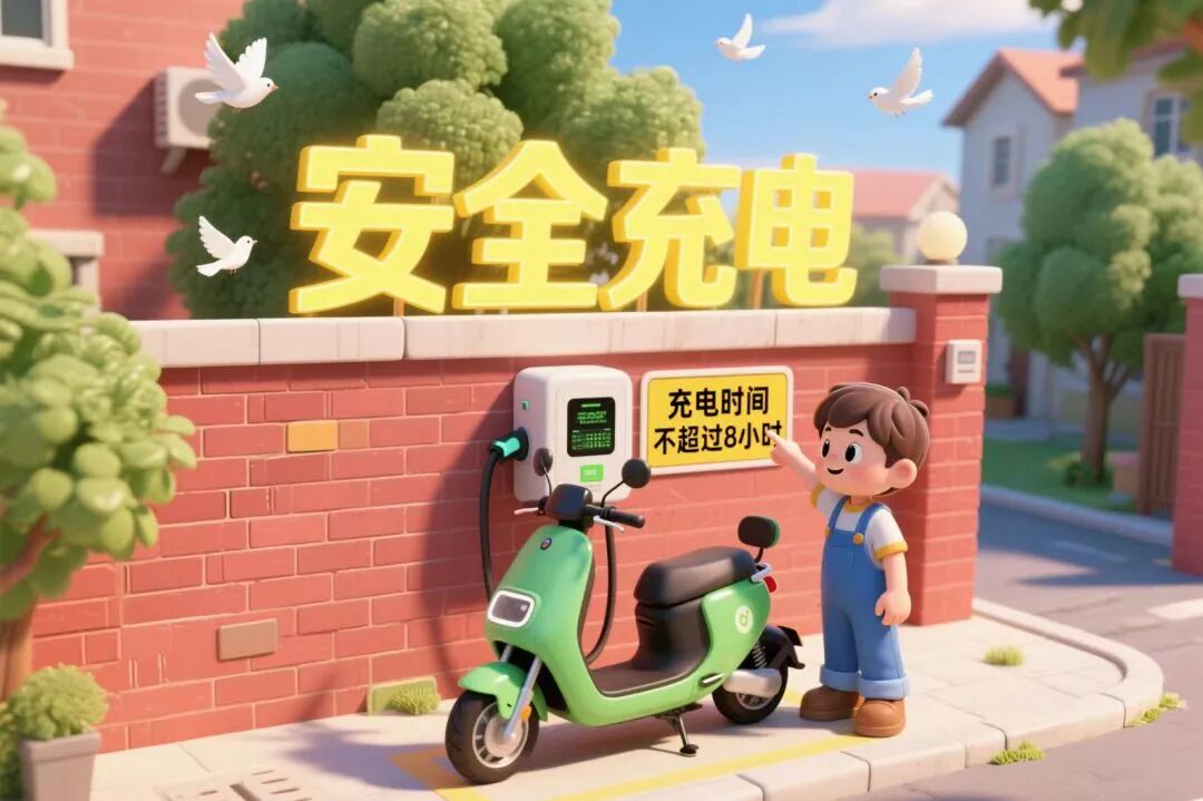 电动自行车充电应在室外充电场所,不私拉电线“飞线”充电,充电时务必使用原装充电器。