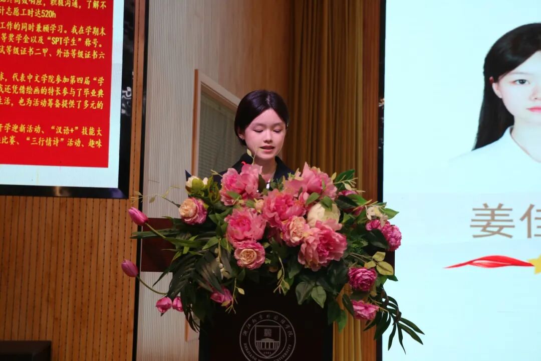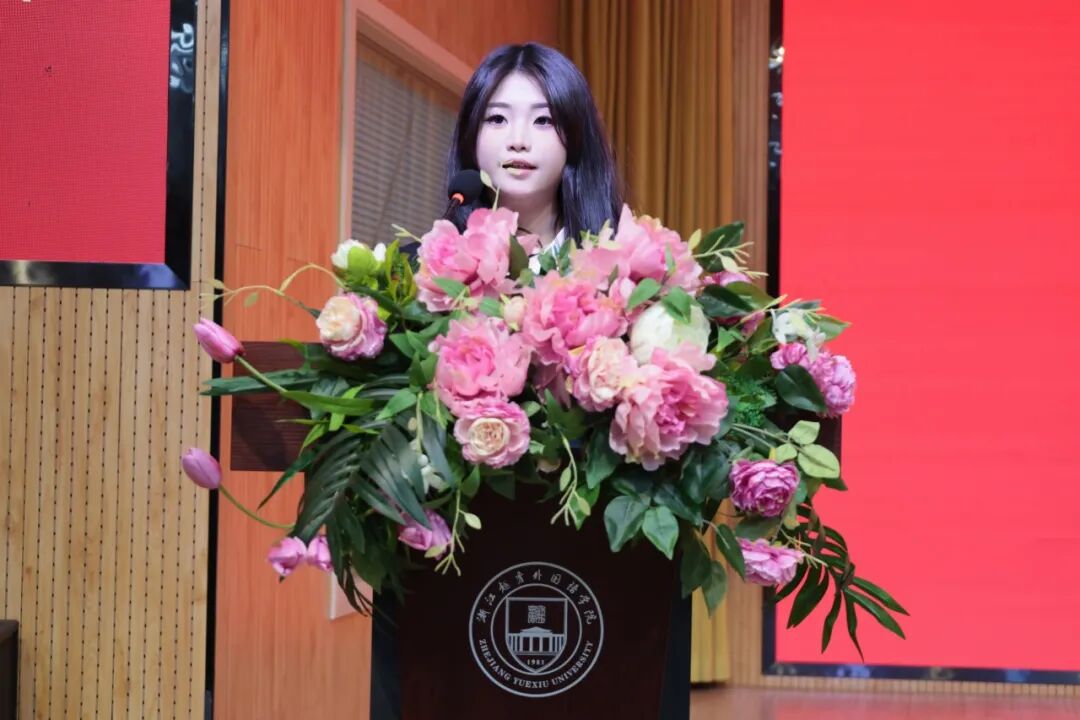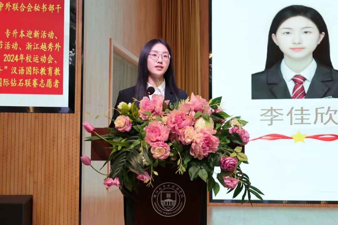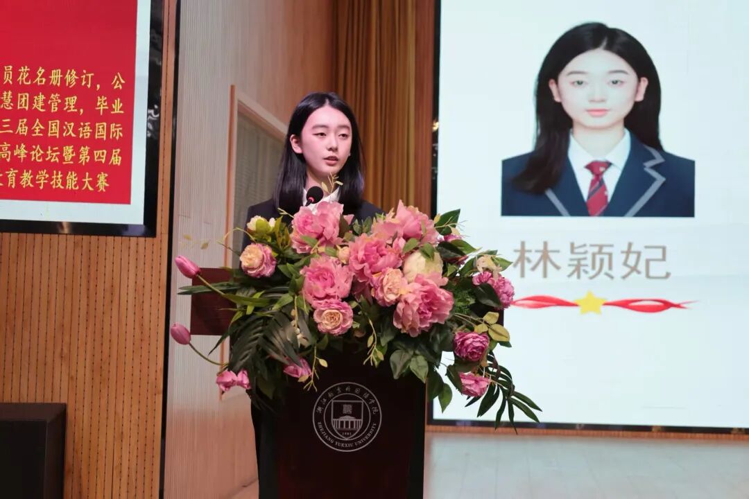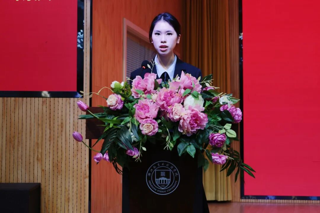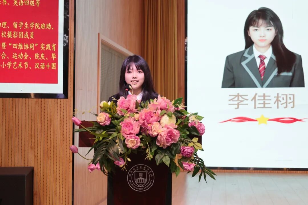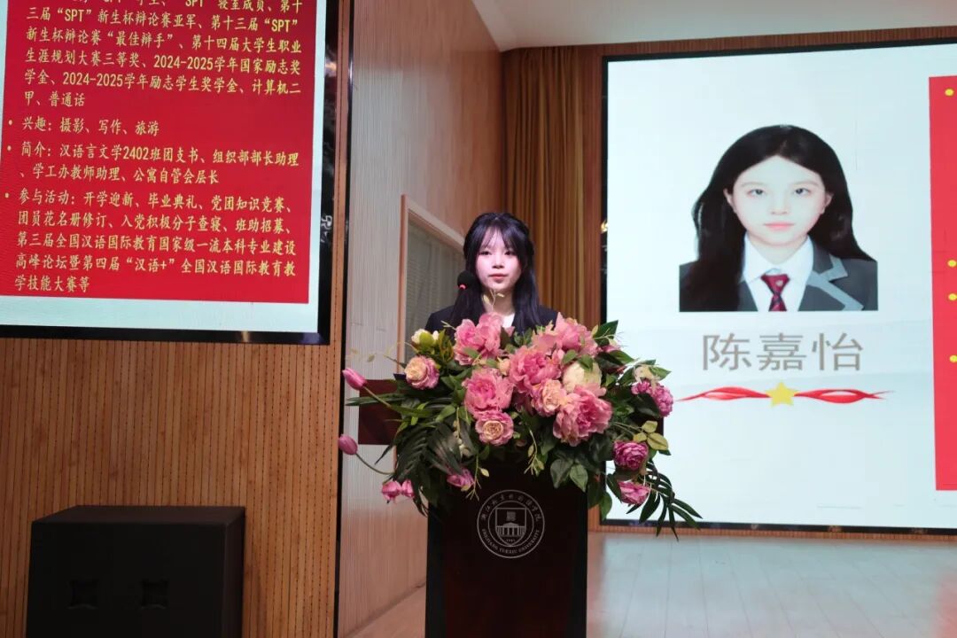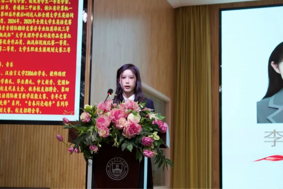 中国语言文化学院学生助理联合会主席陈柏吟宣读《浙江越秀外国语学院中国语言文化学院四届一次团员、学生代表大会总监票人、总计票人、计票人、监票人名单(草案)》。