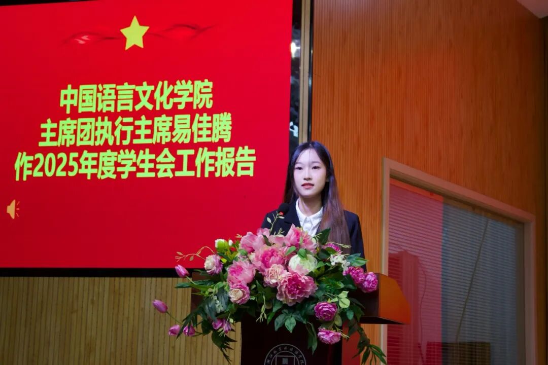 中国语言文化学院主席团团委副书记徐诗琪与中国语言文化学院主席团执行主席易佳腾,分别作2025年度团委工作报告和2025年度学生会工作报告。