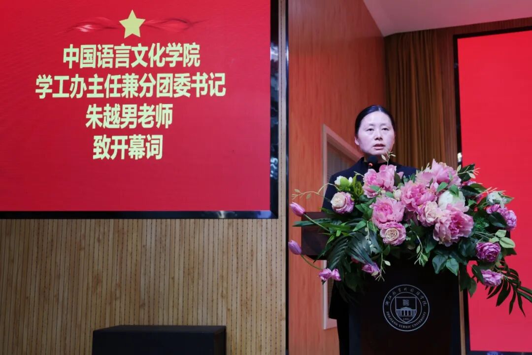 会议伊始,大会主持人钱欣怡老师报告了大会出席情况,并介绍了与会的领导、嘉宾。在庄严的国歌声中,全体与会人员肃立致敬。中国语言文化学院学工办主任兼分团委书记朱越男老师致开幕词,并预祝大会取得圆满成功。