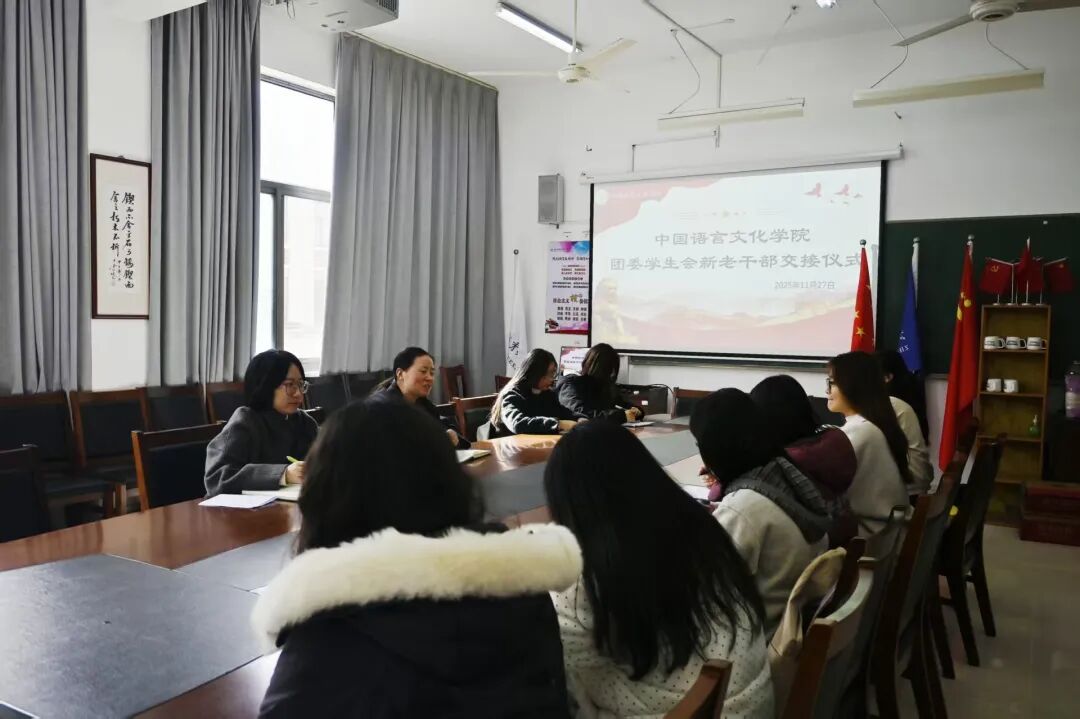 2025年11月27日,中国语言文化学院团委学生会新老部长交接仪式在3-313召开。本次会议由院学工办主任兼分团委书记朱越男老师主持、团委学生会指导老师钱欣怡及主席团成员、各新老部长出席本次会议。