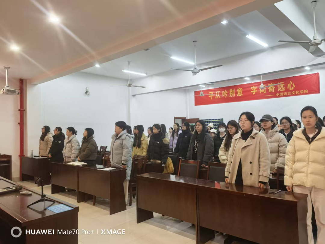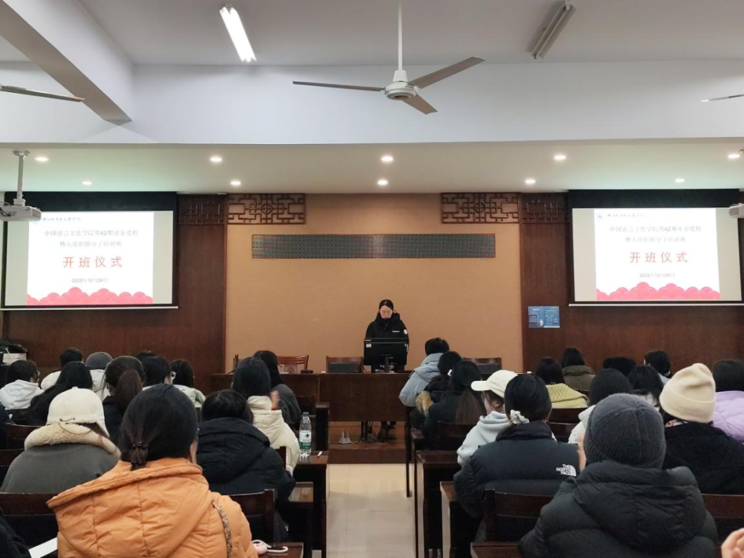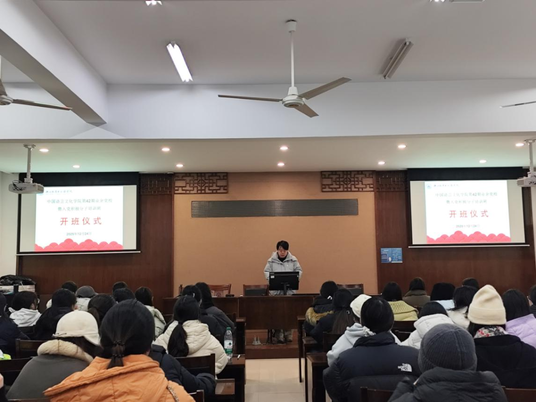 为深入贯彻新时代党的建设总要求,扎实推进入党积极分子培养教育,以党的创新理论为指导开展系统教育,让红色精神根植思想深处,帮助入党积极分子深化对党的核心认知,筑牢信仰之基、锤炼政治品格、提升能力素养,端正入党动机、坚定理想信念,为党组织培育信念坚定、担当有为、作风扎实的新时代后备力量。2025年12月24日,中国语言文化学院党委举行了第42期业余党校暨入党积极分子培训班开班仪式。学院党委副书记曹笑玮、学生第一党支部支部书记鲁琪敏、学生第二党支部支部书记何雯丽、以及本期推优的52名入党积极分子参与了此次活动。开班仪式由学院党委组织员谢曼老师主持。