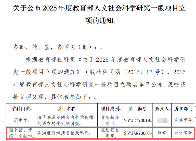 热烈祝贺我院贾娟教授主持的《香港藏敦煌遗书校录整理》课题获2025年度浙江省教育部人文社会科学