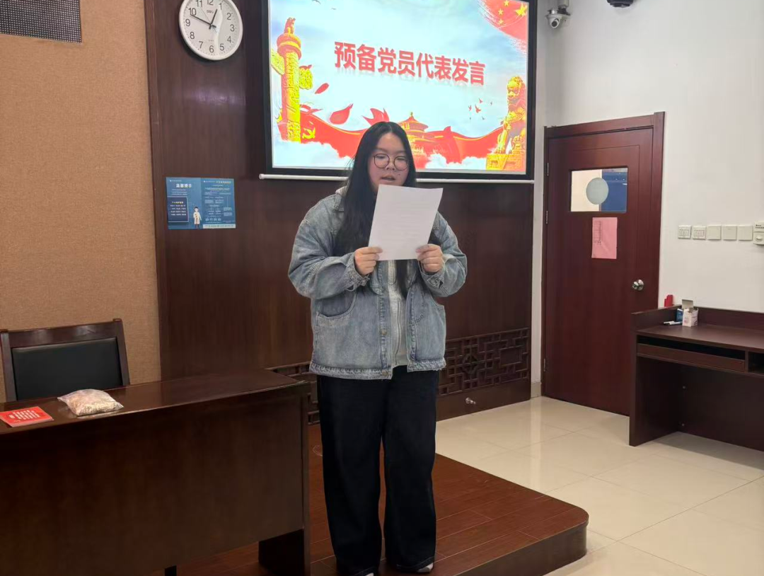 随后,潘晨希同志代表新发展预备党员发言,她表示未来定会把入党誓词内化于心、外化于行。将时刻以党员标准严格要求自己,坚持不断提升自己的思想政治素养,本着全心全意为人民服务的根本宗旨,不断提高自己为人民、为同学服务的本领和能力,充分发挥党员的先锋模范作用,为党和国家建设贡献青春力量。