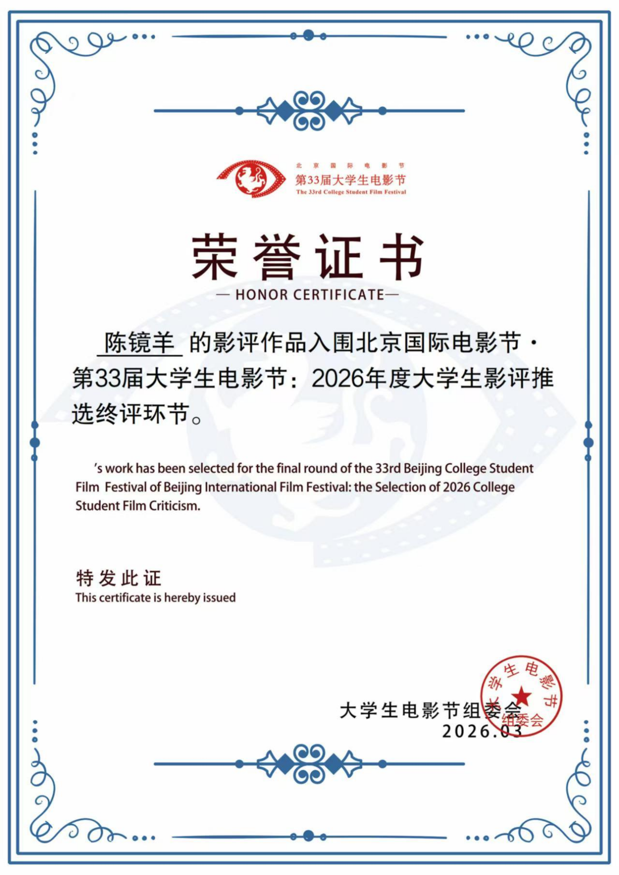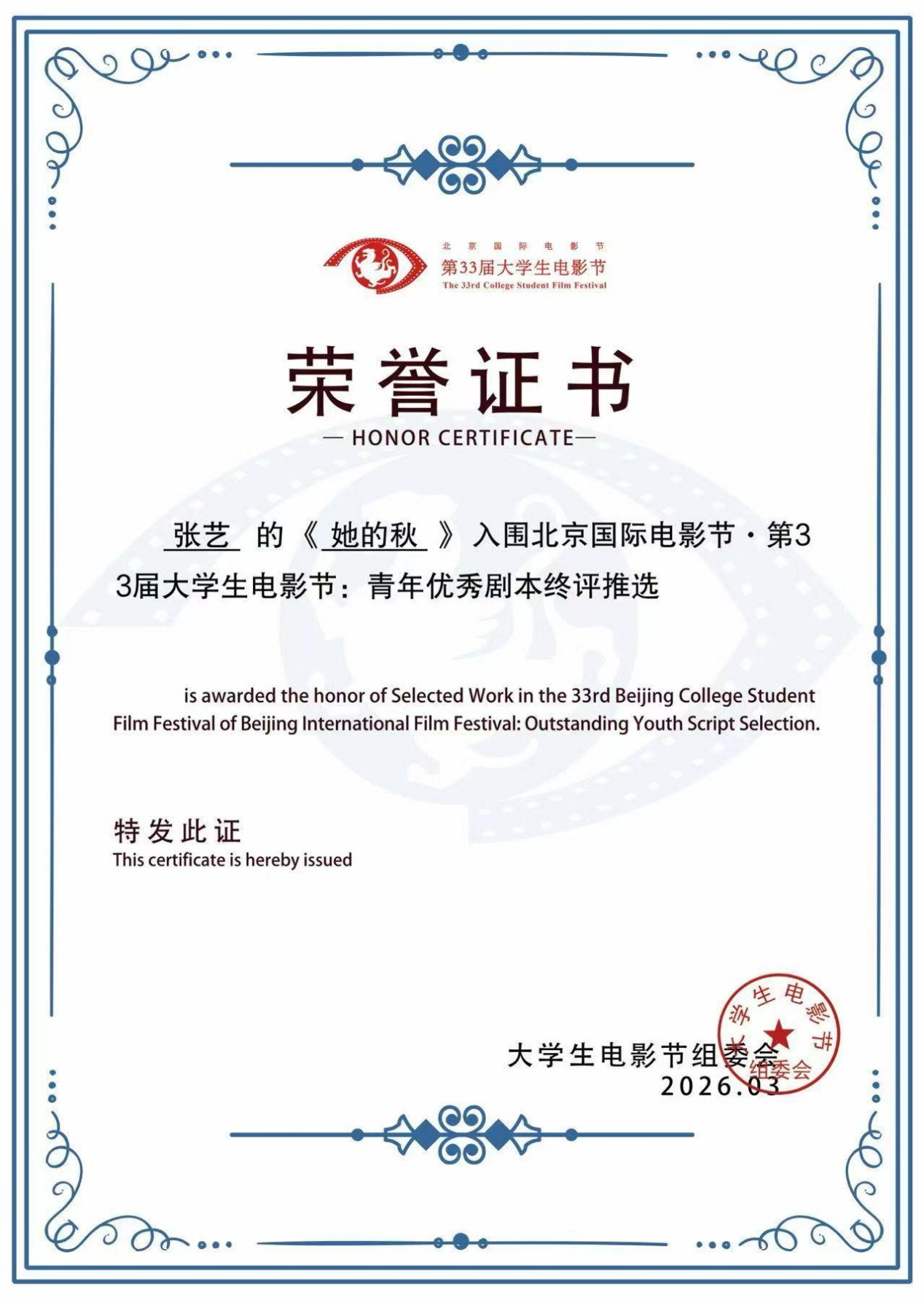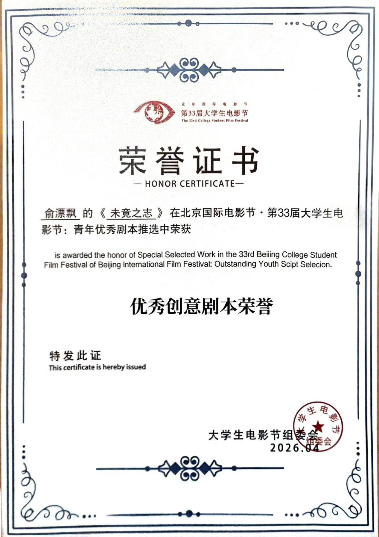 喜报丨丨中文学院戏文学子斩获北京国际电影节·第33届大学生电影节多项荣誉
